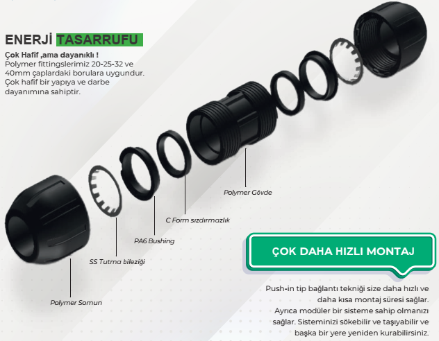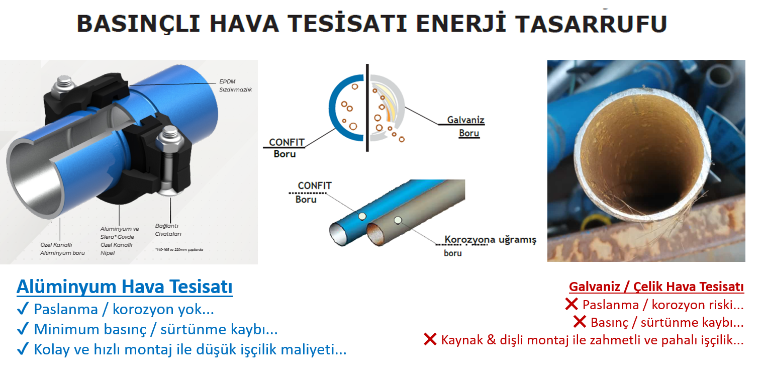 Kompresör çıkışından son kullanım noktasına kadar temiz ve dalgalanmayan bir basınçlıhava akışını ve dış ortamlardaki dayanıklığı garanti ediyoruz. Sızdırmazlık ve düşük basınç kaybı sayesinde işletmenizdeki bakım giderleri ve zaman kaybı minimize olacaktır.