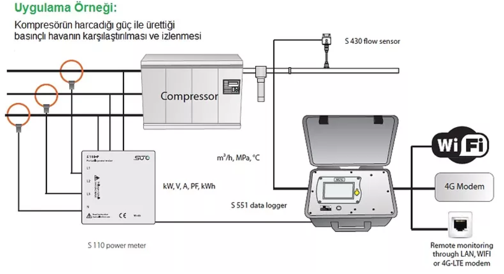 • Yandaki uygulama resminde de anlaşıldığı üzere kompresörün tükettiği gerçek güç tüketiminin anlık volt ve amper (3 faz) bilgisini kW cinsinden ölçer.