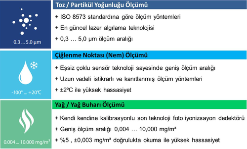 • Tek bir cihazda beş parametre ölçebilir. Bunlar; Partikül sayacı, çiğlenme noktası / nem, yağ buharı, sıcaklık ve basınç